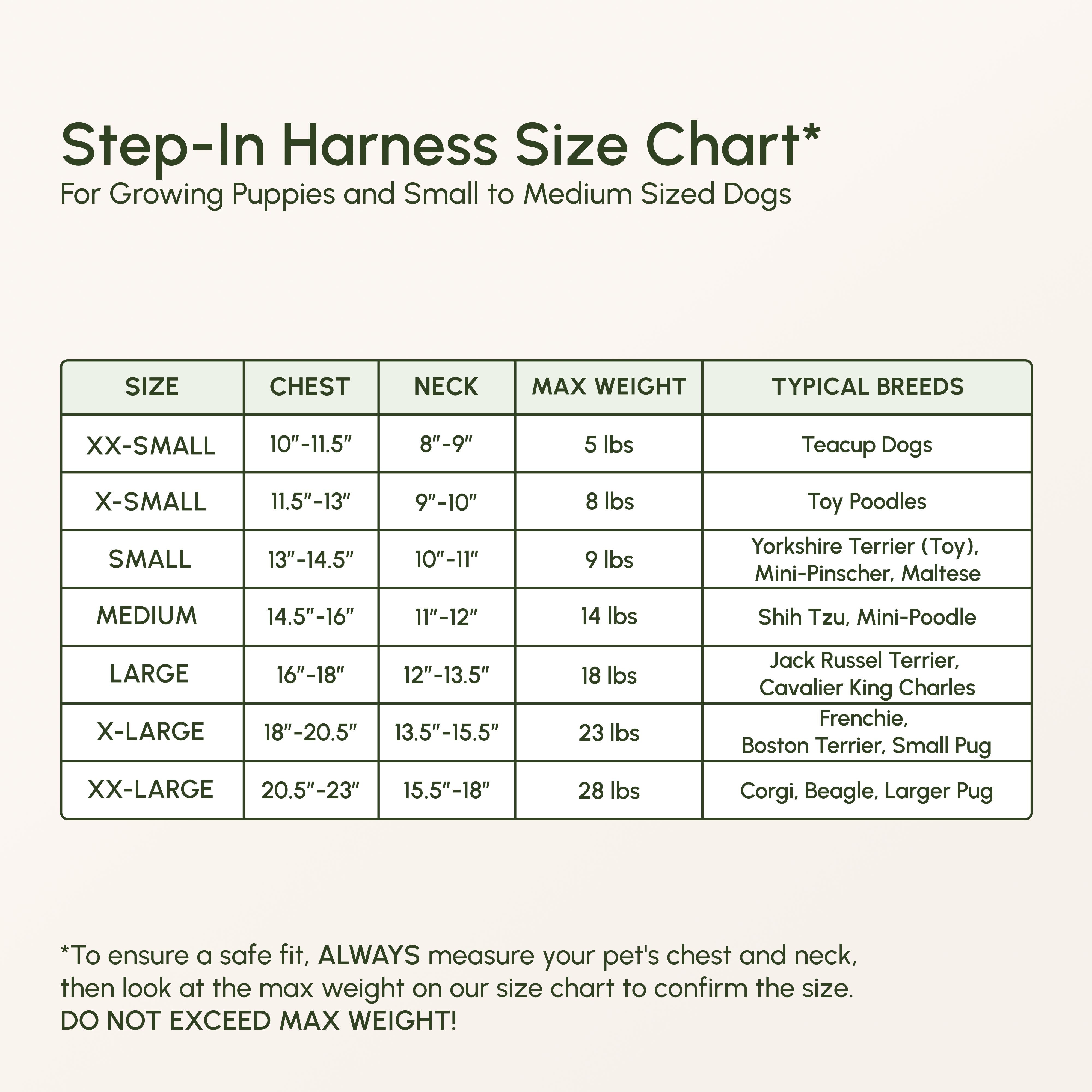 *To ensure a safe fit, ALWAYS measure your pet's chest and neck, then look at the max weight on our size chart to confirm the size. DO NOT EXCEED MAX WEIGHT!