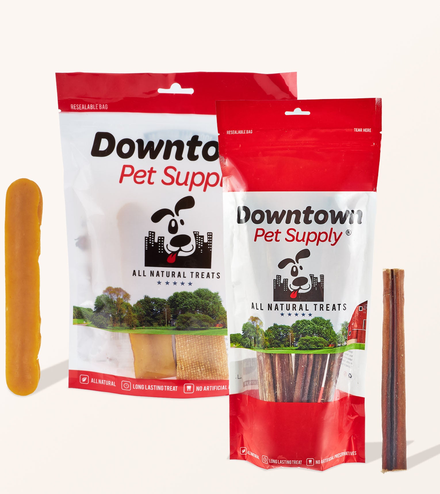 1/2 LB of yak chews (~2 chews) and a 5-pack of our classic long-lasting bully sticks.