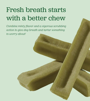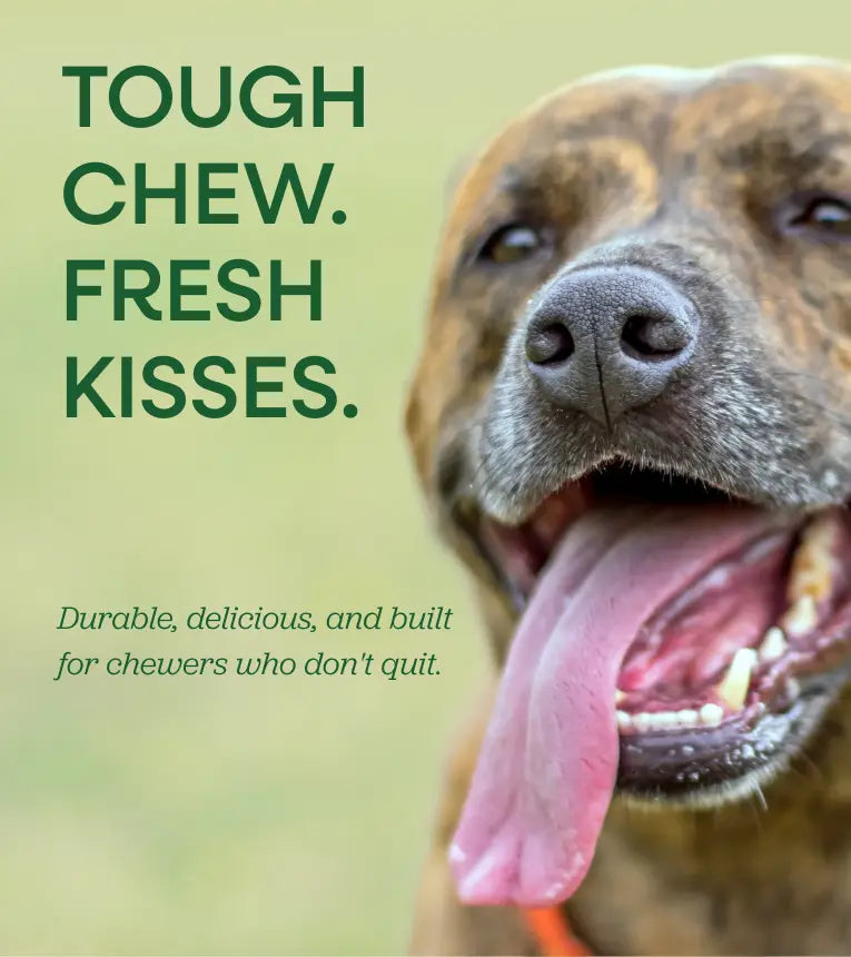 - Dual-action Breath Freshening: The subtle mint flavor helps support fresher breath as dogs chew, which in turn scrapes off harmful plaque and tartar for healthier teeth and gums.
