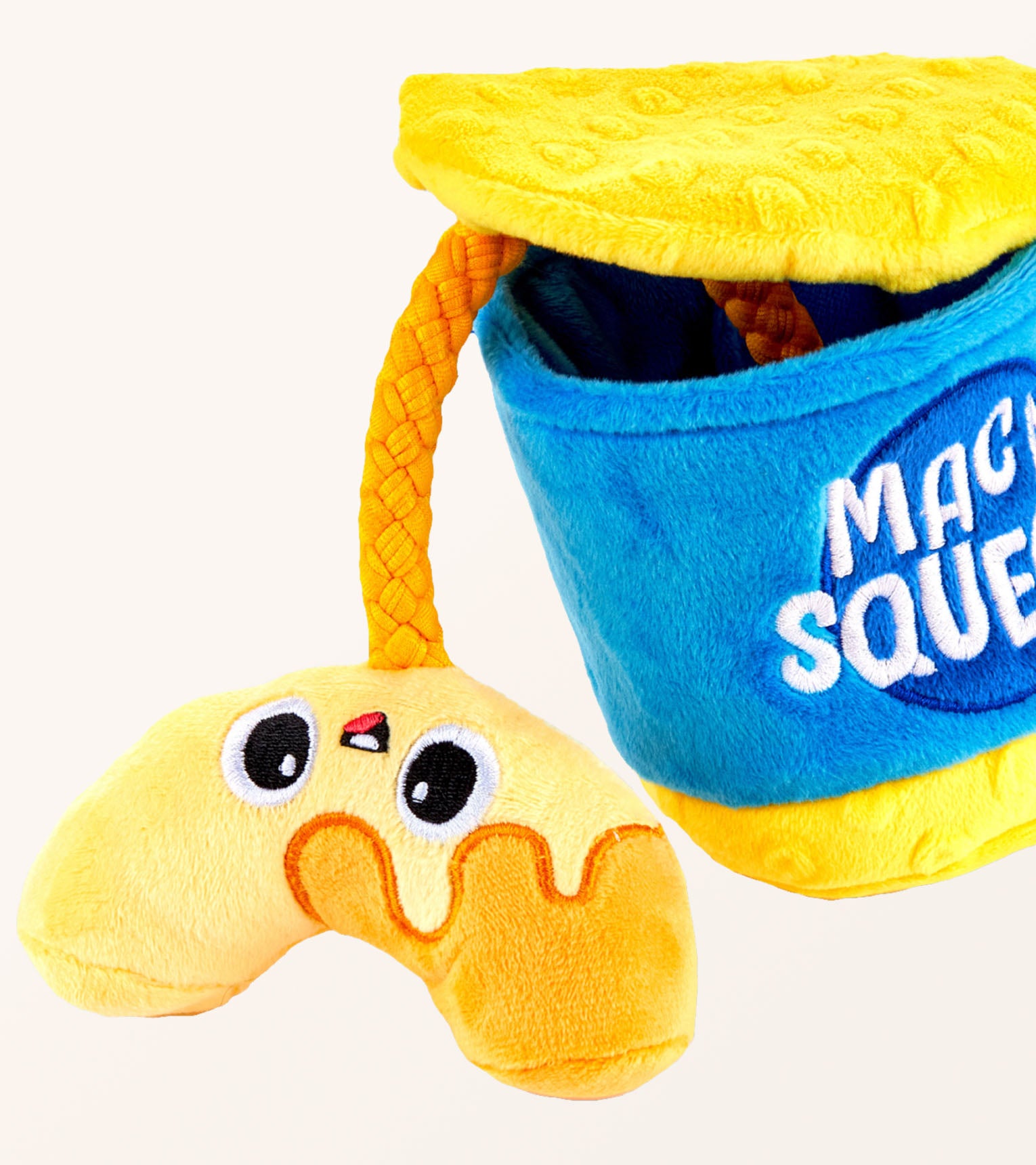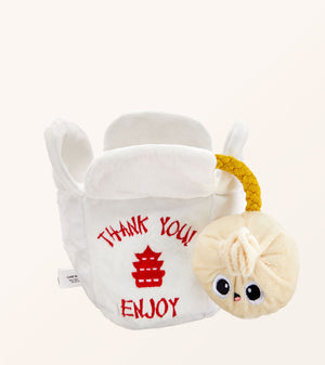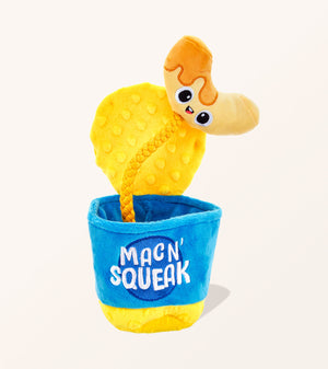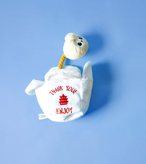 Treat your dog to hours of entertainment with our fun plush dog toy. Packed with interactive features and delightful sounds, it's the perfect addition to any pet's toy collection. With a built-in squeaker and crinkly food container, this plush toy promises endless hide-and-squeak fun for your dog. Stimulate their natural hunting instinct and keep them engaged for hours on end. Engage your pup in lively tug-of-war battles or entertaining games of fetch with this interactive toy. Crafted from high-quality materials, it can handle even the most enthusiastic play sessions. Whether your dog plays solo or enjoys bonding with you, our adorable chew toy promotes physical activity and alleviates boredom. Select from two charming styles to suit your furry friend's preferences - the Asian Takeout Plush Toy or the Mac and Cheese Plush Toy - or choose both for endless fun.