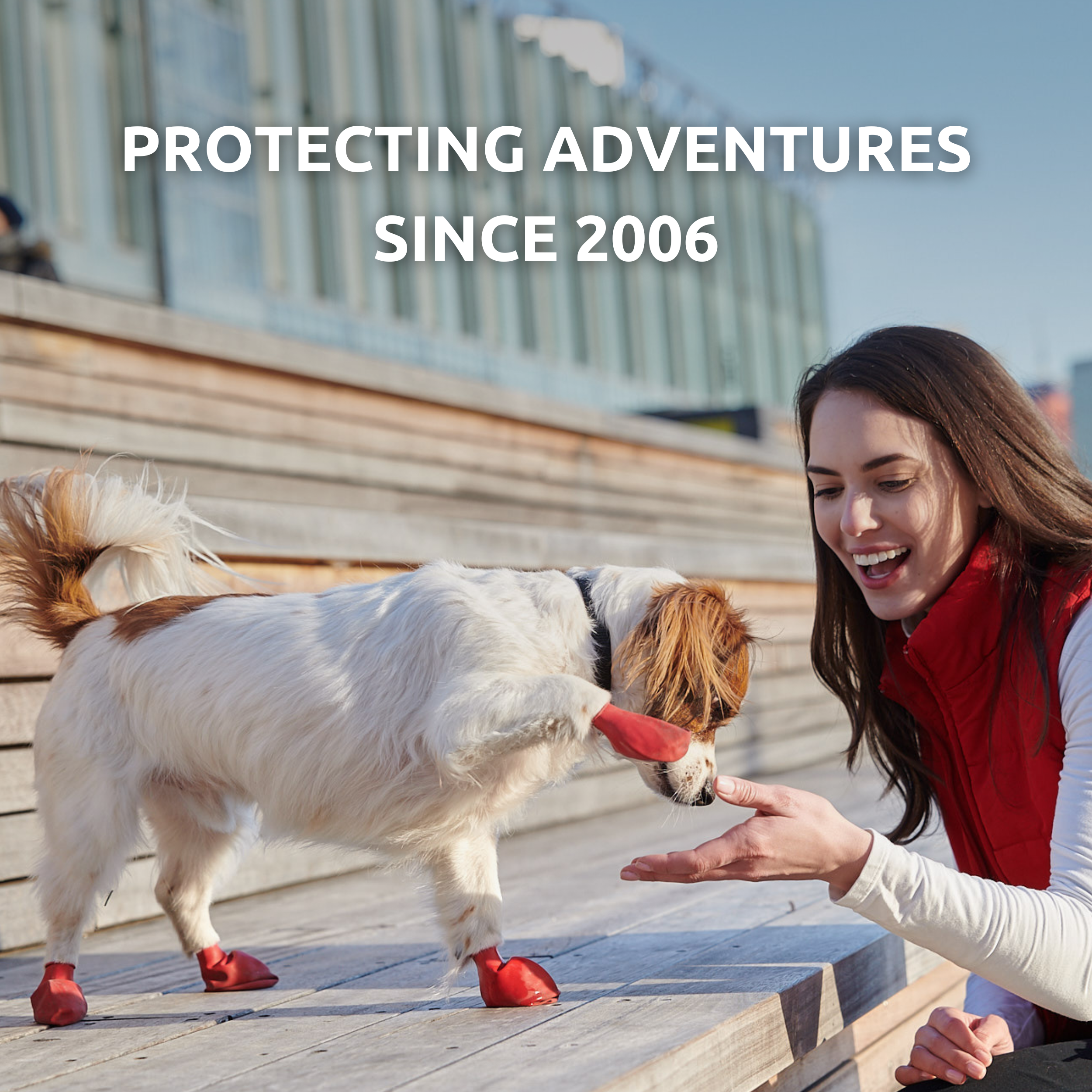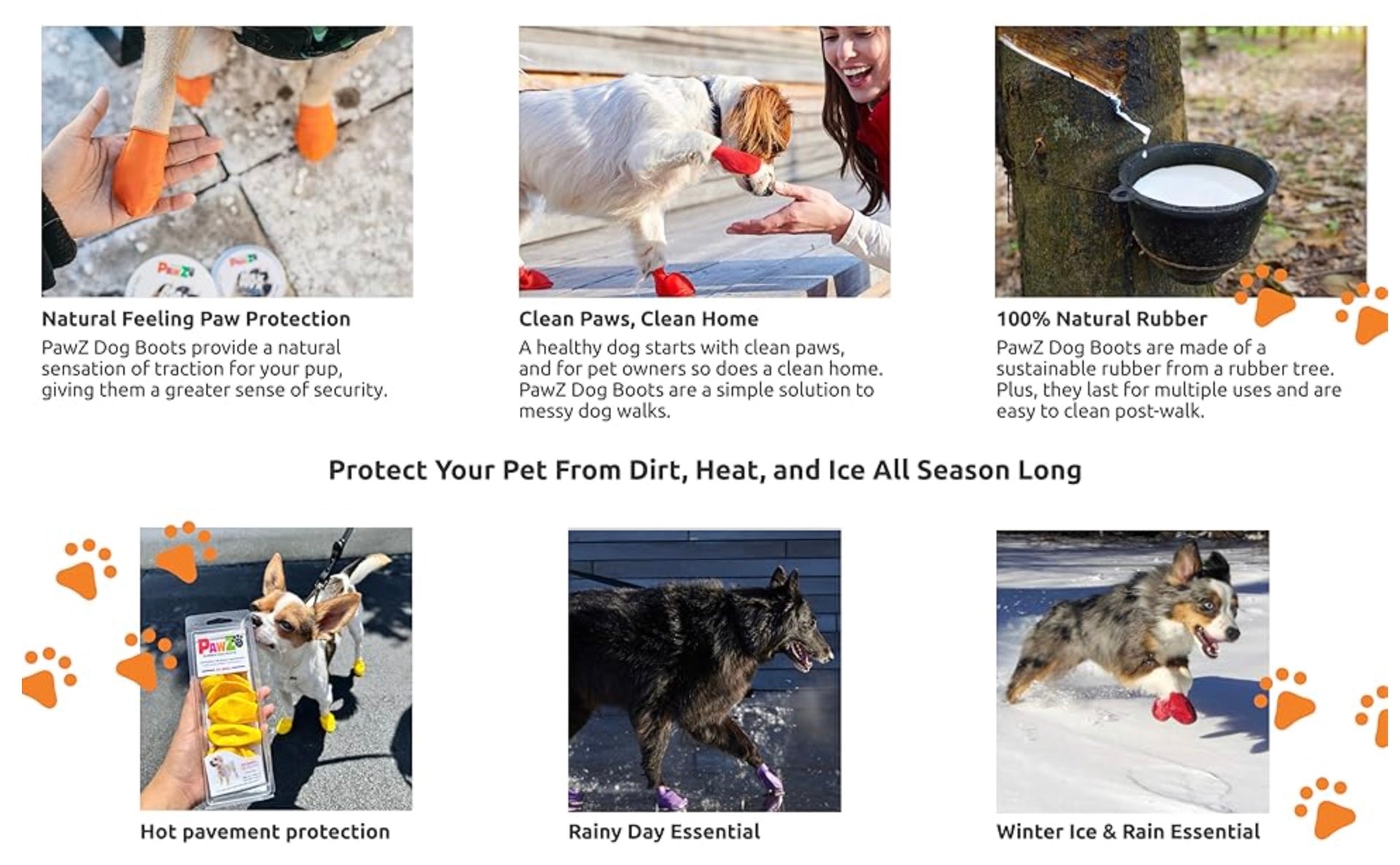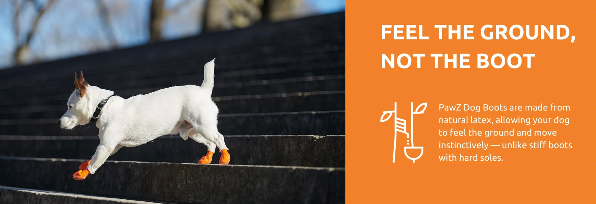 PawZ Rubber Dog Boots offer durable, flexible protection against hot pavement, snow, ice, and harmful chemicals. Designed to let your dog's paws feel the ground naturally, they provide secure footing on any terrain.