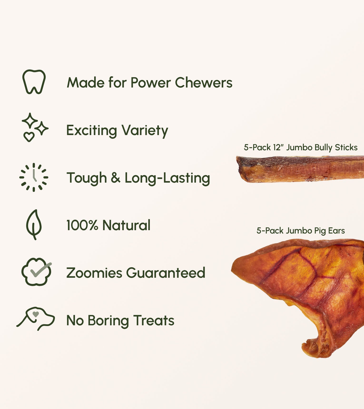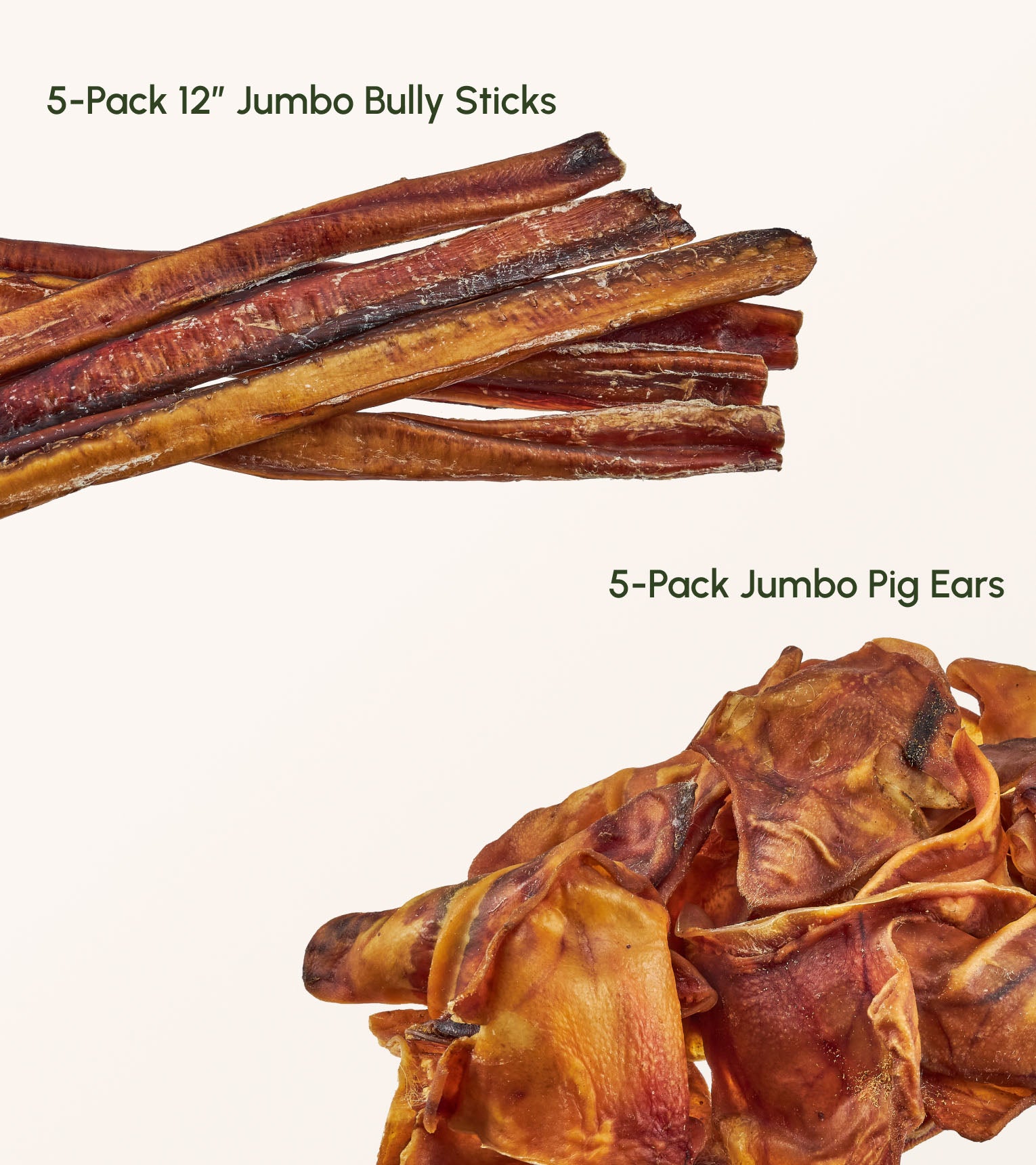 Exciting Variety – Jumbo Bully Sticks & Pig Ears keep things fresh.