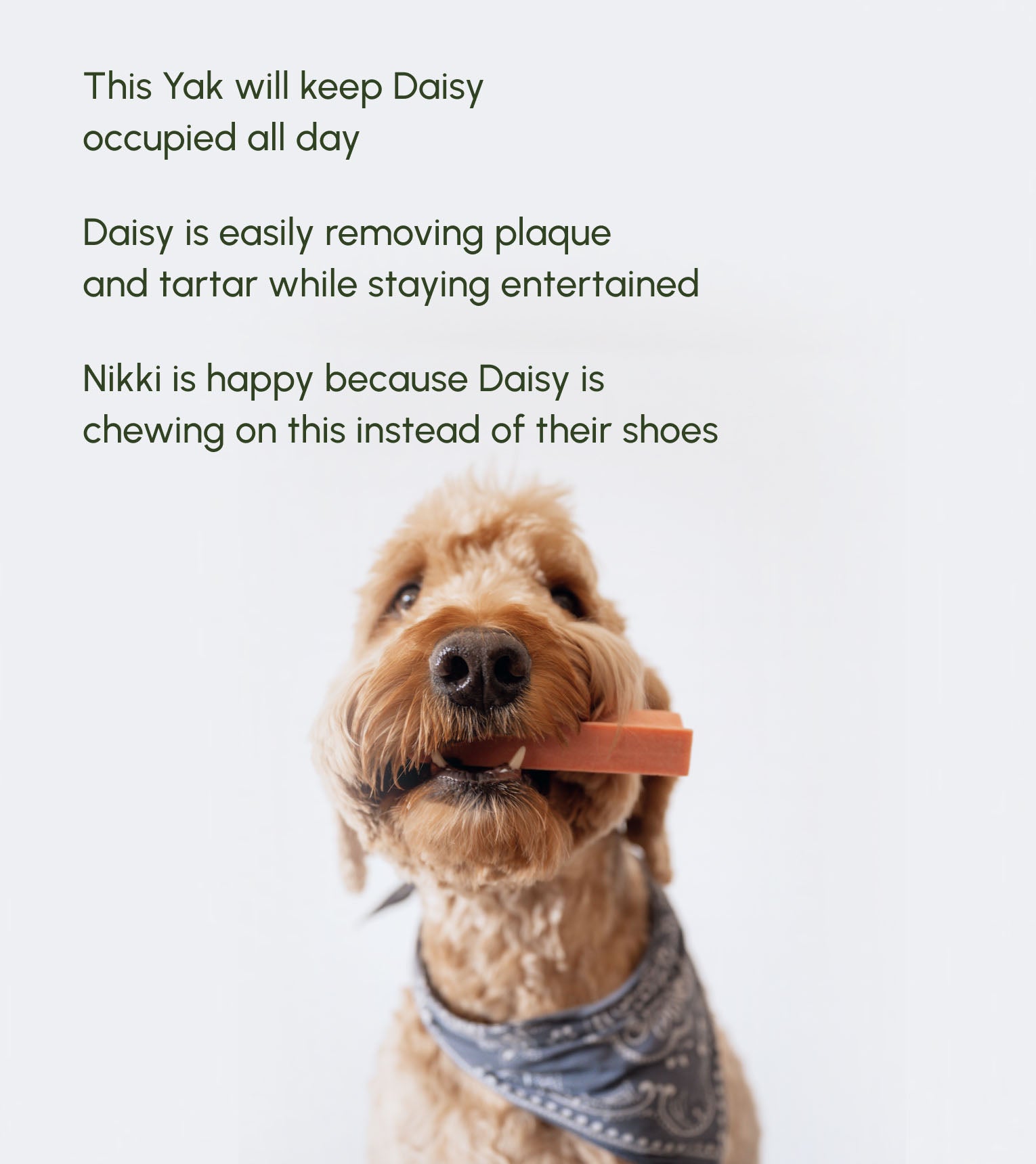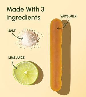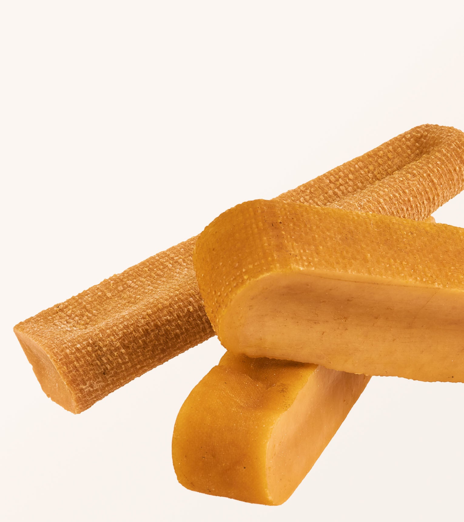 Meet the chew that outlasts your dog’s attention span. Our Himalayan Yak Chews are tough, tasty, and totally odorless. Made from just yak milk, cow milk, lime juice, and a pinch of salt, these natural, limited-ingredient chews are a smarter way to satisfy your dog’s natural chewing instincts.